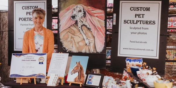 I have had many different careers in my life within the Art and fashion industries, and taught Visual Arts, Photography and Ceramics for nearly 21 years before resigning in 2014 to begin my business: Karen Scott Murals. I paint custom pet portraits paintings, wall murals, pet portraiture on stones, and refurbished vintage saws. I also sculpt pets, and make quirky teapots, planters, canisters and Christmas Tree decorations based on your pet photos!